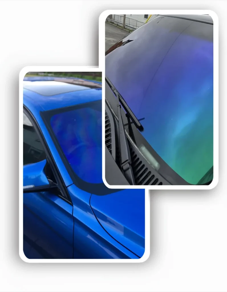 Chameleon windscreen tinting is a high-performance vehicle enhancement that applies a multi-layered optical film to the front windshield. This film creates a dynamic, color-shifting effect that changes based on light angle, ambient brightness, and viewing perspective—commonly shifting between hues like blue, purple, and green.